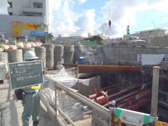 当工事は安謝川整備事業の一環として国道330号線古島インター付近を横断しているボックスカルバートの排水能力を向上させるため、新設トンネル部の地山保持としてパイプルーフを構築します。